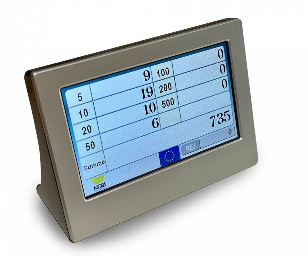 Wird während der Zählung ein Geldschein als falsch oder verdächtig erkannt, wird dieser in das obere Auswurffach, Rejectfach ausgegeben ohne die Zählung zu unterbrechen. So wird eine schnelle Zählung ohne nervende Stopps möglich. Nach Entnahme der gezählten Geldscheine erscheint automatisch eine detaillierte Auflistung der Zählung auf dem Touch-Display. Sie sehen sofort die Stückzahlen der einzelnen Geldscheinwerte und die Euro-Summe dieser Geldsorte. Das große Display ermöglicht die Anzeige aller Euro-Notenwerte, als 5€/10€/20€/50€/100€/200€/500€ auf einen Blick.